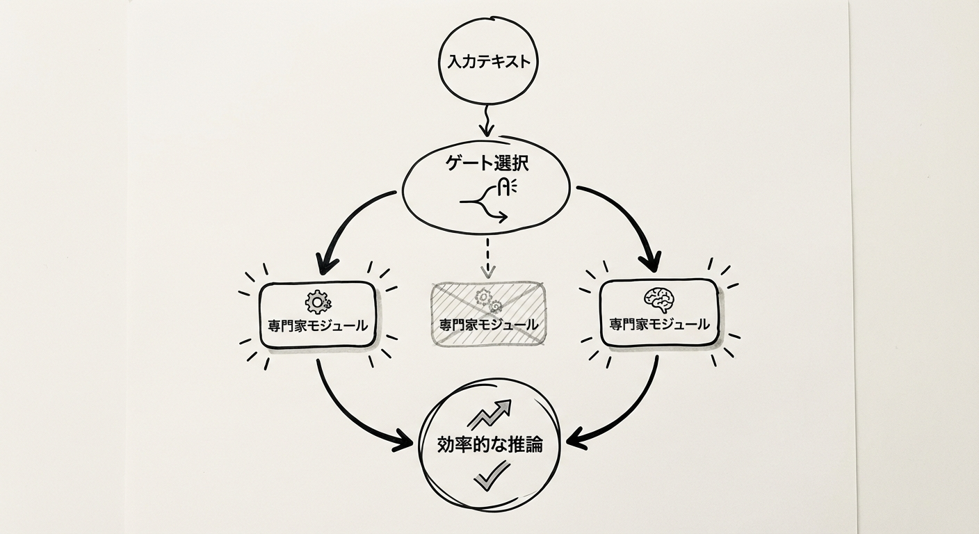 MoE(Mixture of Experts)は、複数の「専門家(Expert)」サブネットワークを組み合わせた構造を持つアーキテクチャです。通常のトランスフォーマーモデルが全パラメータを均一に活用するのとは異なり、MoE では入力トークンごとに「ゲートネットワーク(Router)」が最も適切な専門家を動的に選択し、選ばれた一部の専門家のみが処理を担当します。