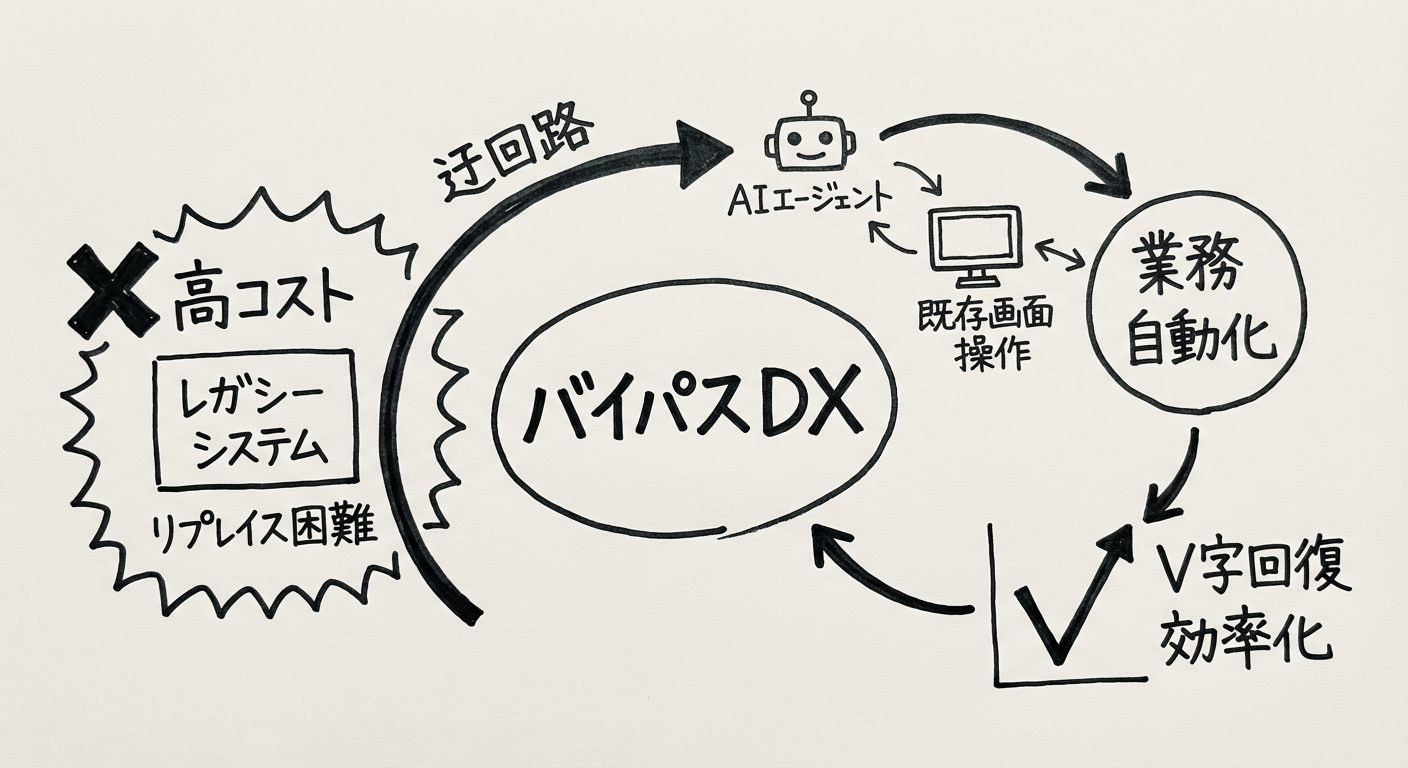 図2: 「バイパス的DX」の概念 — 高コストなシステムリプレイスを行わずに、AIエージェントが既存UIを操作して業務を自動化する