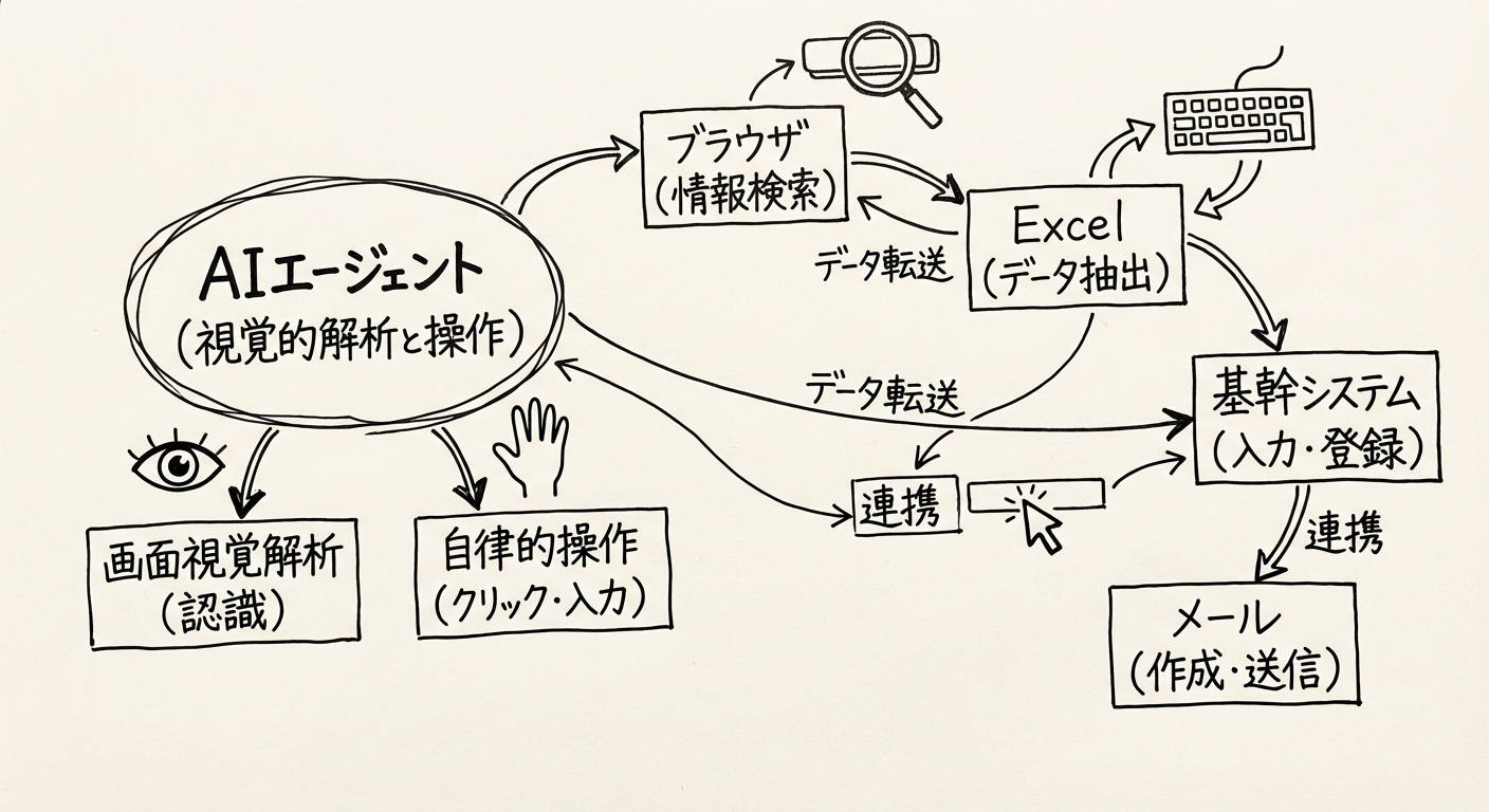 図1: GPT-5.4がPCのGUI画面を視覚的に解析し、複数のアプリケーションを跨いだ業務フローを自律的に実行するアーキテクチャ