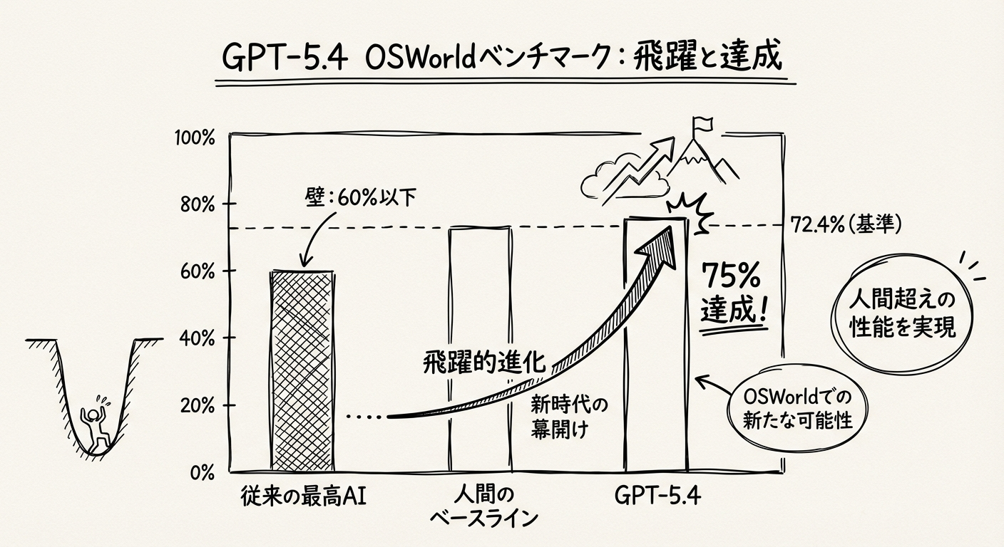 図2: OSWorld-Vベンチマーク結果の比較 — GPT-5.4は人間のベースライン(72.4%)を超える75%を達成。従来の最高水準AIが60%未満だったことと比較して歴史的な飛躍
