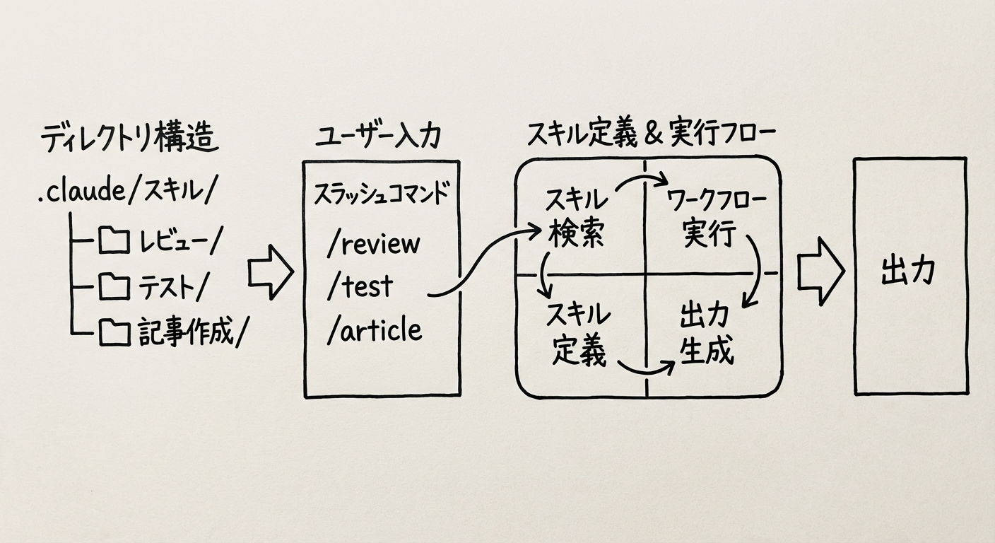Claude Codeのスキルシステムは、繰り返し行うタスクを標準化するための仕組みです。.claude/skills/ディレクトリにスキル定義ファイルを配置します。
