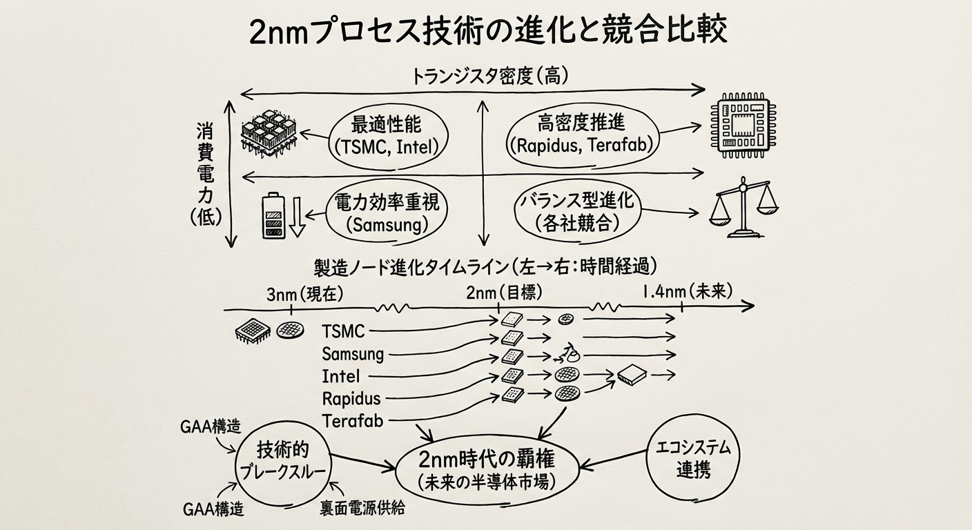 2nmという数字は、半導体上に刻まれるトランジスタの構造サイズを表す指標です。ただし現代の製造技術では、この数字は厳密な物理的寸法ではなく、世代を示す技術ノードとしての意味合いが強くなっています。